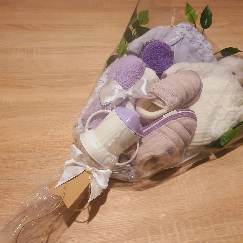 تأتي ملفوفة على شكل باقة أزهار بالنايلون الشفاف ومزينة بالشبر مع بطاقة لكتابة رسالة